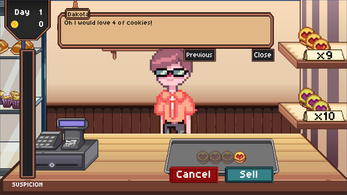 Days are split between preparation and execution. Nights are for buying supplies and planning your next moves. You can buy Normal and Poisoned Cookies. Days bring five random villagers to your counter, each with their own personality, dialogue, and unfortunately for them, different levels of poison resistance.